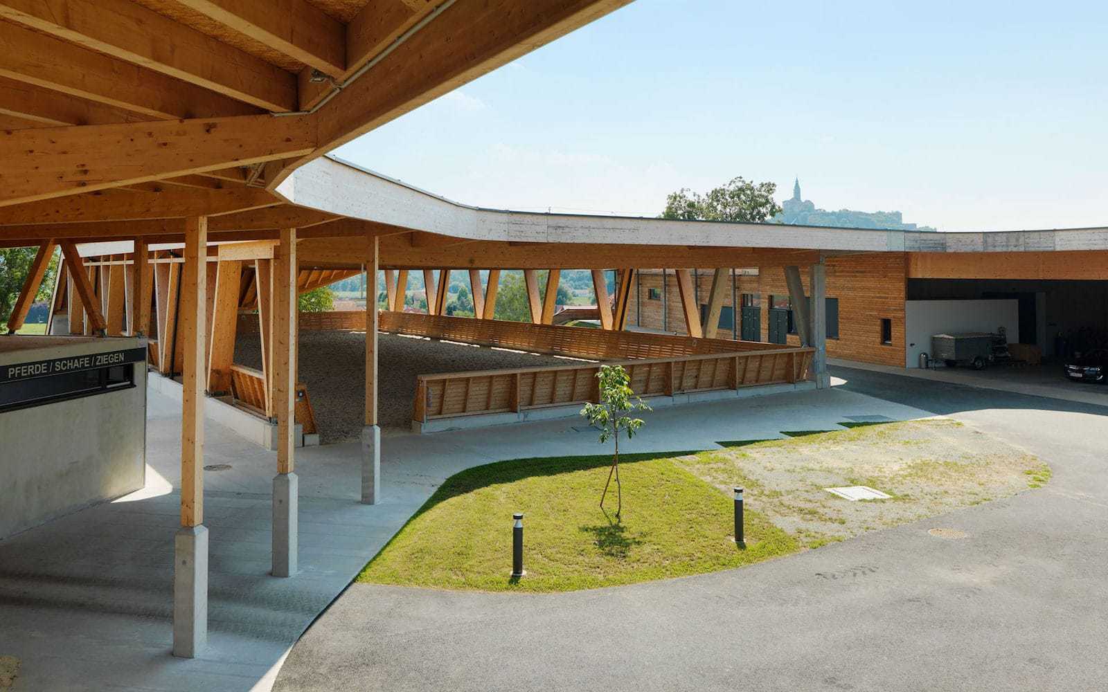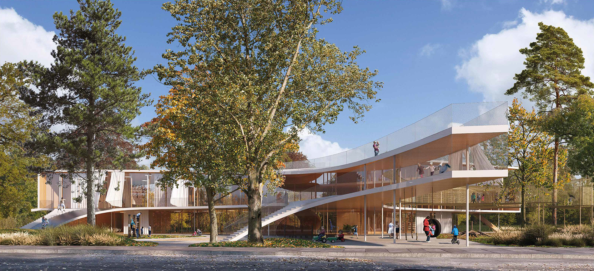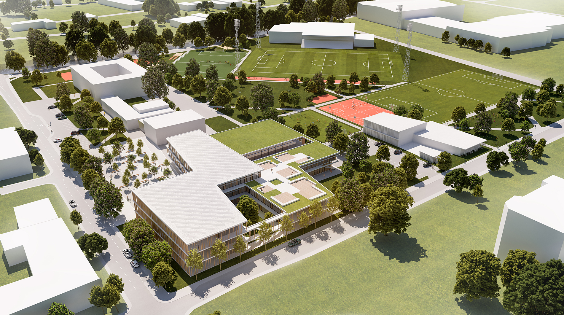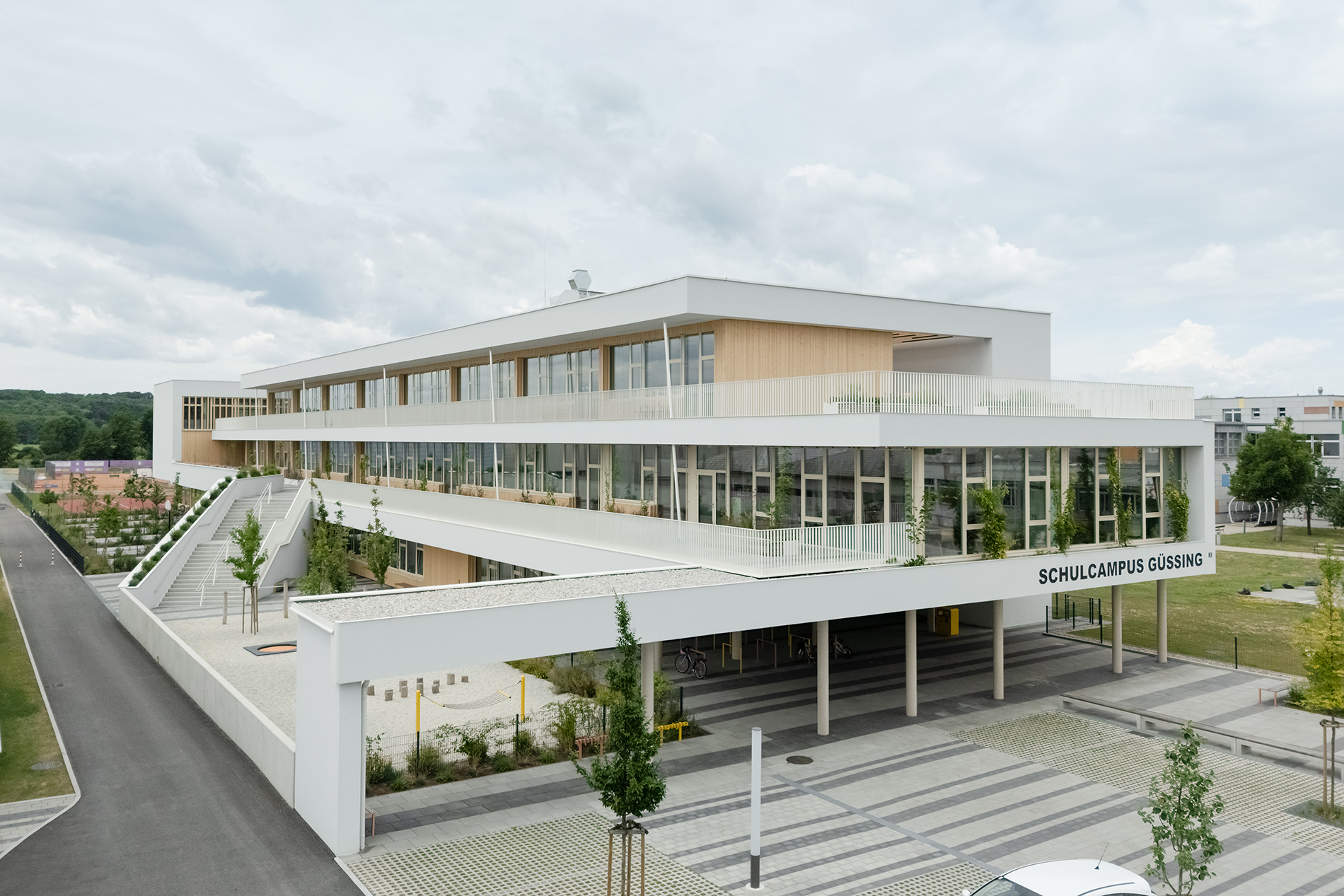 Mit den beiden Geschoßen der Departments betritt man anschließend eine andere Welt. Sie sind einfach auf den Fachwerken aufgeständert und als Vollgeschoß mit eingeschnittenem Hof bzw. U-förmig zum Quartierspark ausgerichtet konzipiert. Die Verwaltung befindet sich im 2. Obergeschoß, nahe von der Aula erreichbar. Alle Lehrerarbeitsplätze sind dezentral verteilt und den jeweiligen Departments zugeordnet. Sowohl Schülerinnen und Schüler als auch das Lehrpersonal haben jeweils Zutritt zu großzügigen Freibereichen, entweder in Form des Hofes oder von vorgelagerten Terrassen mit Blick in den Park.